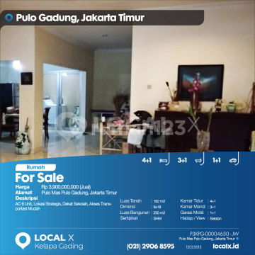 AC 6 Unit, Lokasi Strategis, Dekat Sekolah, Akses Transportasi Mudah For Sale - Jual Rumah Pulo Mas Pulo Gadung, Jakarta Timur Harga. Rp 390000xxxxJual) Deskripsi Properti. AC 6 Unit, Lokasi Strategis, Dekat Sekolah, Akses Transportasi Mudah Luas Tanah. 162 m2 Dimensi. 9x18 Luas Bangunan. 250 m2 Sertipikat. SHM Kamar Tidur. 4+1 Kamar Mandi. 3+1 Garasi Mobil. 1+1 Hadap / View. Selatan LOCAL X Kelapa Gading ******** 0212906xxxx P3KPG-0000xxxx-JW-J