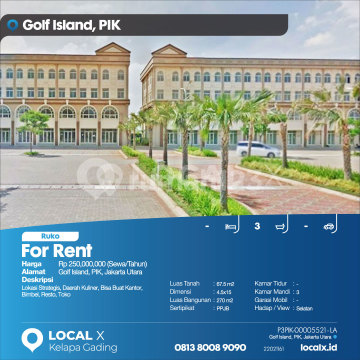 Lokasi Strategis, Daerah Kuliner, Bisa Buat Kantor, Bimbel, Resto, Toko For Rent - Sewa Ruko Golf Island, PIK, Jakarta Utara Harga. Rp 25000xxxxSewa/Tahun) Deskripsi Properti. Lokasi Strategis, Daerah Kuliner, Bisa Buat Kantor, Bimbel, Resto, Toko Luas Tanah. 67.5 m2 Dimensi. 4.5x15 Luas Bangunan. 270 m2 Sertipikat. PPJB Kamar Tidur. - Kamar Mandi. 3 Garasi Mobil. - Hadap / View. Selatan LOCAL X Kelapa Gading ******** 0813xxxxxxxx P3PIK-0000xxxx-LA-S