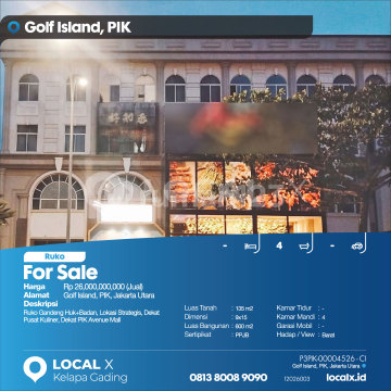 Ruko Gandeng Huk+Badan, Lokasi Strategis, Dekat Pusat Kuliner, Dekat PIK Avenue Mall For Sale - Jual Ruko Golf Island, PIK, Jakarta Utara Harga. Rp 2600000xxxxJual) Deskripsi Properti. Ruko Gandeng Huk+Badan, Lokasi Strategis, Dekat Pusat Kuliner, Dekat PIK Avenue Mall Luas Tanah. 135 m2 Dimensi. 9x15 Luas Bangunan. 600 m2 Sertipikat. PPJB Kamar Tidur. - Kamar Mandi. 4 Garasi Mobil. - Hadap / View. Barat LOCAL X Kelapa Gading ******** 0813xxxxxxxx P3PIK-0000xxxx-CI-J