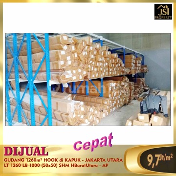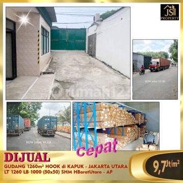 DIJUAL GUDANG 1260m² HOOK di KAPUK - JAKARTA UTARA Strategis, Bebas Banjir, Lokasi Aman, 3 Menit ke PIK , 3 Menit ke Tol JORR , penghubung PIK dan Jakarta Barat Luas Tanah 1260 m² Luas Bangunan 1000 m²(50 m x 50) Sertifikat SHM Hadap Barat-Utara Harga 9.7Jt/m² Nego