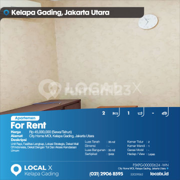 Unit Rapi, Fasilitas Lengkap, Lokasi Strategis, Dekat Mall Of Indonesia, Dekat Dengan Tol Dan Akses Kendaraan Umum For Rent - Sewa Apartemen City Home MOI Tower Hawaiian Bay Lt.19 Kelapa Gading, Jakarta Utara Harga. Rp 45,000,000 (Sewa/Tahun) Deskripsi Properti. Unit Rapi, Fasilitas Lengkap, Lokasi Strategis, Dekat Mall Of Indonesia, Dekat Dengan Tol Dan Akses Kendaraan Umum Luas Tanah. 35 m2 Dimensi. - Luas Bangunan. 35 m2 Sertipikat. SHM Kamar Tidur. 2 Kamar Mandi. 1 Garasi Mobil. - Hadap / View. Lepas LOCAL X Kelapa Gading ******** ⓪②① ②⑨⓪⑥ ⑧⑤⑨⑤ P3KPG-0000xxxx-WN-S
