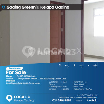 Lokasi Strategis, Dekat Sekolah, Tempat Makan For Sale - Jual Apartemen Gading Greenhill Tower A Lt.26 Kelapa Gading, Jakarta Utara Harga. Rp 41000xxxxJual) Deskripsi Properti. Lokasi Strategis, Dekat Sekolah, Tempat Makan Luas Tanah. 40 m2 Dimensi. - Luas Bangunan. 40 m2 Sertipikat. SHMSRS Kamar Tidur. 2 Kamar Mandi. 1 Garasi Mobil. - Hadap / View. View Pool LOCAL X Kelapa Gading ******** ⓪②① ②⑨⓪⑥ ⑧⑤⑨⑤ P3KPG-0000xxxx-JW-J