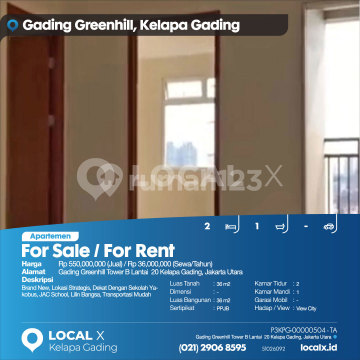 Brand New, Lokasi Strategis, Dekat Dengan Sekolah Yakobus, JAC School, Lilin Bangsa, Transportasi Mudah For Sale / For Rent - Jual / Sewa Apartemen Gading Greenhill Tower B Lantai 20 Kelapa Gading, Jakarta Utara Harga. Rp 55000xxxxJual) / Rp 3600xxxxSewa/Tahun) Deskripsi Properti. Brand New, Lokasi Strategis, Dekat Dengan Sekolah Yakobus, JAC School, Lilin Bangsa, Transportasi Mudah Luas Tanah. 36 m2 Dimensi. - Luas Bangunan. 36 m2 Sertipikat. PPJB Kamar Tidur. 2 Kamar Mandi. 1 Garasi Mobil. - Hadap / View. View City LOCAL X Kelapa Gading ******** ⓪②① ②⑨⓪⑥ ⑧⑤⑨⑤ P3KPG-0000xxxx-TA-J/S