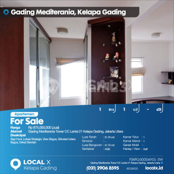 Siap Huni, Lokasi Strategis, View Bagus, Sirkulasi Udara Bagus, Dekat Sekolah For Sale - Jual Apartemen Gading Mediterania Tower CC Lantai 21 Kelapa Gading, Jakarta Utara Harga. Rp 875,000,000 (Jual) Deskripsi Properti. Siap Huni, Lokasi Strategis, View Bagus, Sirkulasi Udara Bagus, Dekat Sekolah Luas Tanah. 51.75 m2 Dimensi. - Luas Bangunan. 51.75 m2 Sertipikat. HGB Kamar Tidur. 1 Kamar Mandi. 1 Garasi Mobil. - Hadap / View. Golf LOCAL X Kelapa Gading ******** ⓪②① ②⑨⓪⑥ ⑧⑤⑨⑤ P3KPG-0000xxxx-EW-J