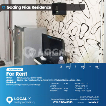 Furnished, Unit Rapi, Siap Huni, Lokasi Strategis For Rent - Sewa Apartemen Gading Nias Residence Tower Alamanda Lt.12 Kelapa Gading, Jakarta Utara Harga. Rp 2800xxxxSewa/Tahun) Deskripsi Properti. Furnished, Unit Rapi, Siap Huni, Lokasi Strategis Luas Tanah. 35 m2 Dimensi. - Luas Bangunan. 35 m2 Sertipikat. PPJB Kamar Tidur. 2 Kamar Mandi. 1 Garasi Mobil. - Hadap / View. Barat LOCAL X Kelapa Gading ******** ⓪②① ②⑨⓪⑥ ⑧⑤⑨⑤ P3KPG-0000xxxx-TA-S
