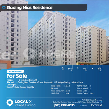 Dekat LRT, Dekat Sekolah, Dekat Mall For Sale - Jual Apartemen Gading Nias Residence Tower Alamanda Lt.19 Kelapa Gading, Jakarta Utara Harga. Rp 23000xxxxJual) Deskripsi Properti. Dekat LRT, Dekat Sekolah, Dekat Mall Luas Tanah. 35 m2 Dimensi. - Luas Bangunan. 35 m2 Sertipikat. PPJB Kamar Tidur. 2 Kamar Mandi. 1 Garasi Mobil. - Hadap / View. Timur LOCAL X Kelapa Gading ******** ⓪②① ②⑨⓪⑥ ⑧⑤⑨⑤ P3KPG-0000xxxx-EW-J