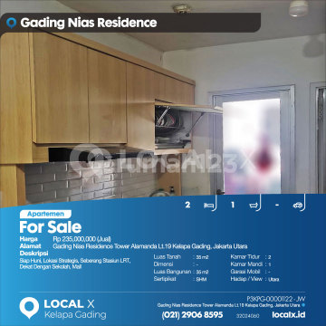 Siap Huni, Lokasi Strategis, Seberang Stasiun LRT, Dekat Dengan Sekolah, Mall For Sale - Jual Apartemen Gading Nias Residence Tower Alamanda Lt.19 Kelapa Gading, Jakarta Utara Harga. Rp 23500xxxxJual) Deskripsi Properti. Siap Huni, Lokasi Strategis, Seberang Stasiun LRT, Dekat Dengan Sekolah, Mall Luas Tanah. 35 m2 Dimensi. - Luas Bangunan. 35 m2 Sertipikat. SHM Kamar Tidur. 2 Kamar Mandi. 1 Garasi Mobil. - Hadap / View. Utara LOCAL X Kelapa Gading ******** ⓪②① ②⑨⓪⑥ ⑧⑤⑨⑤ P3KPG-0000xxxx-JW-J