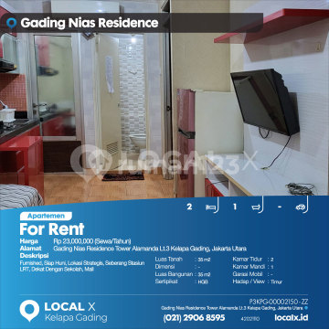 Furnished, Siap Huni, Lokasi Strategis, Seberang Stasiun LRT, Dekat Dengan Sekolah, Mall For Rent - Sewa Apartemen Gading Nias Residence Tower Alamanda Lt.3 Kelapa Gading, Jakarta Utara Harga. Rp 2300xxxxSewa/Tahun) Deskripsi Properti. Furnished, Siap Huni, Lokasi Strategis, Seberang Stasiun LRT, Dekat Dengan Sekolah, Mall Luas Tanah. 35 m2 Dimensi. - Luas Bangunan. 35 m2 Sertipikat. HGB Kamar Tidur. 2 Kamar Mandi. 1 Garasi Mobil. - Hadap / View. Timur LOCAL X Kelapa Gading ******** ⓪②① ②⑨⓪⑥ ⑧⑤⑨⑤ P3KPG-0000xxxx-ZZ-S