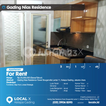 Furnished, Siap Huni, Lokasi Strategis For Rent - Sewa Apartemen Gading Nias Residence Tower Bougenville Lantai 11, Kelapa Gading, Jakarta Utara Harga. Rp 25,000,000 (Sewa/Tahun) Deskripsi Properti. Furnished, Siap Huni, Lokasi Strategis Luas Tanah. 35 m2 Dimensi. - Luas Bangunan. 35 m2 Sertipikat. PPJB Kamar Tidur. 2 Kamar Mandi. 1 Garasi Mobil. - Hadap / View. Barat LOCAL X Kelapa Gading ******** ⓪②① ②⑨⓪⑥ ⑧⑤⑨⑤ P3KPG-0000xxxx-ZZ-S