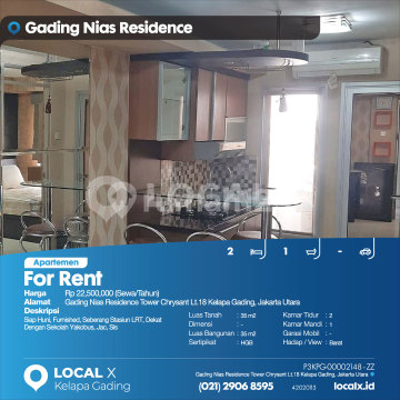 Siap Huni, Furnished, Seberang Stasiun LRT, Dekat Dengan Sekolah Yakobus, Jac, Sis For Rent - Sewa Apartemen Gading Nias Residence Tower Chrysant Lt.18 Kelapa Gading, Jakarta Utara Harga. Rp 2250xxxxSewa/Tahun) Deskripsi Properti. Siap Huni, Furnished, Seberang Stasiun LRT, Dekat Dengan Sekolah Yakobus, Jac, Sis Luas Tanah. 35 m2 Dimensi. - Luas Bangunan. 35 m2 Sertipikat. HGB Kamar Tidur. 2 Kamar Mandi. 1 Garasi Mobil. - Hadap / View. Barat LOCAL X Kelapa Gading ******** ⓪②① ②⑨⓪⑥ ⑧⑤⑨⑤ P3KPG-0000xxxx-ZZ-S