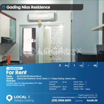 Furnished, Siap Huni, Seberang Stasiun LRT, Dekat Sekolah Yakobus, Jac, Sis For Rent - Sewa Apartemen Gading Nias Residence Tower Dahlia Lt.11 Kelapa Gading, Jakarta Utara Harga. Rp 22,000,000 (Sewa/Tahun) Deskripsi Properti. Furnished, Siap Huni, Seberang Stasiun LRT, Dekat Sekolah Yakobus, Jac, Sis Luas Tanah. 35 m2 Dimensi. - Luas Bangunan. 35 m2 Sertipikat. SHM Kamar Tidur. 2 Kamar Mandi. 1 Garasi Mobil. - Hadap / View. Selatan LOCAL X Kelapa Gading ******** ⓪②① ②⑨⓪⑥ ⑧⑤⑨⑤ P3KPG-0000xxxx-ZZ-S