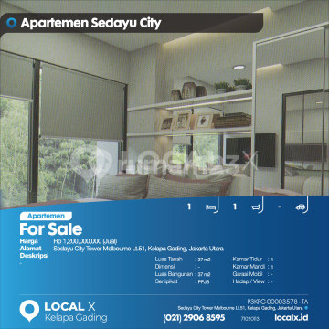 For Sale - Jual Apartemen Sedayu City Tower Melbourne Lt.51, Kelapa Gading, Jakarta Utara Harga. Rp 120000xxxxJual) Deskripsi Properti. Luas Tanah. 37 m2 Dimensi. - Luas Bangunan. 37 m2 Sertipikat. PPJB Kamar Tidur. 1 Kamar Mandi. 1 Garasi Mobil. - Hadap / View. - LOCAL X Kelapa Gading ******** ⓪②① ②⑨⓪⑥ ⑧⑤⑨⑤ P3KPG-0000xxxx-TA-J