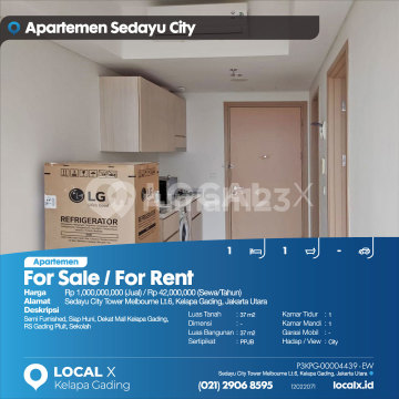 Semi Furnished, Siap Huni, Dekat Mall Kelapa Gading, RS Gading Pluit, Sekolah For Sale / For Rent - Jual / Sewa Apartemen Sedayu City Tower Melbourne Lt.6, Kelapa Gading, Jakarta Utara Harga. Rp 100000xxxxJual) / Rp 4200xxxxSewa/Tahun) Deskripsi Properti. Semi Furnished, Siap Huni, Dekat Mall Kelapa Gading, RS Gading Pluit, Sekolah Luas Tanah. 37 m2 Dimensi. - Luas Bangunan. 37 m2 Sertipikat. PPJB Kamar Tidur. 1 Kamar Mandi. 1 Garasi Mobil. - Hadap / View. City LOCAL X Kelapa Gading ******** ⓪②① ②⑨⓪⑥ ⑧⑤⑨⑤ P3KPG-0000xxxx-EW-J/S