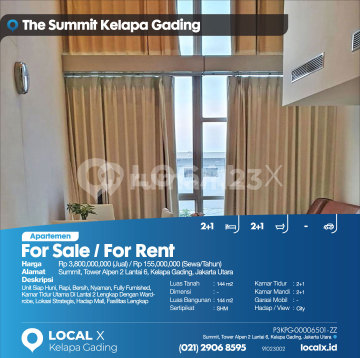 Unit Siap Huni, Rapi, Bersih, Nyaman, Fully Furnished, Kamar Tidur Utama Di Lantai 2 Lengkap Dengan Wardrobe, Lokasi Strategis, Hadap Mall, Fasilitas Lengkap For Sale / For Rent - Jual / Sewa Apartemen Summit, Tower Alpen 2 Lantai 6, Kelapa Gading, Jakarta Utara Harga. Rp 380000xxxxJual) / Rp 15500xxxxSewa/Tahun) Deskripsi Properti. Unit Siap Huni, Rapi, Bersih, Nyaman, Fully Furnished, Kamar Tidur Utama Di Lantai 2 Lengkap Dengan Wardrobe, Lokasi Strategis, Hadap Mall, Fasilitas Lengkap Luas Tanah. 144 m2 Dimensi. - Luas Bangunan. 144 m2 Sertipikat. SHM Kamar Tidur. 2+1 Kamar Mandi. 2+1 Garasi Mobil. - Hadap / View. City LOCAL X Kelapa Gading ******** ⓪②① ②⑨⓪⑥ ⑧⑤⑨⑤ P3KPG-0000xxxx-ZZ-J/S