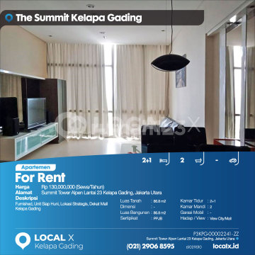 Furnished, Unit Siap Huni, Lokasi Strategis, Dekat Mall Kelapa Gading For Rent - Sewa Apartemen Summit Tower Alpen Lantai 23 Kelapa Gading, Jakarta Utara Harga. Rp 13000xxxxSewa/Tahun) Deskripsi Properti. Furnished, Unit Siap Huni, Lokasi Strategis, Dekat Mall Kelapa Gading Luas Tanah. 86.8 m2 Dimensi. - Luas Bangunan. 86.8 m2 Sertipikat. PPJB Kamar Tidur. 2+1 Kamar Mandi. 2 Garasi Mobil. - Hadap / View. View City/Mall LOCAL X Kelapa Gading ******** ⓪②① ②⑨⓪⑥ ⑧⑤⑨⑤ P3KPG-0000xxxx-ZZ-S
