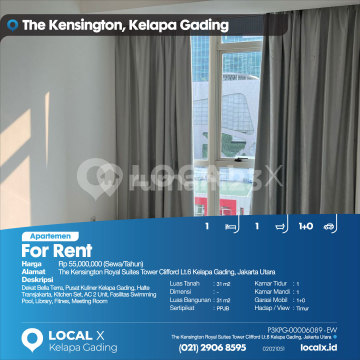 Dekat Bella Terra, Pusat Kuliner Kelapa Gading, Halte Transjakarta, Kitchen Set, AC 2 Unit, Fasilitas Swimming Pool, Library, Fitnes, Meeting Room For Rent - Sewa Apartemen The Kensington Royal Suites Tower Clifford Lt.6 Kelapa Gading, Jakarta Utara Harga. Rp 55,000,000 (Sewa/Tahun) Deskripsi Properti. Dekat Bella Terra, Pusat Kuliner Kelapa Gading, Halte Transjakarta, Kitchen Set, AC 2 Unit, Fasilitas Swimming Pool, Library, Fitnes, Meeting Room Luas Tanah. 31 m2 Dimensi. - Luas Bangunan. 31 m2 Sertipikat. PPJB Kamar Tidur. 1 Kamar Mandi. 1 Garasi Mobil. 1+0 Hadap / View. Timur LOCAL X Kelapa Gading ******** ⓪②① ②⑨⓪⑥ ⑧⑤⑨⑤ P3KPG-0000xxxx-EW-S