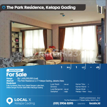 Fully Furnished, Siap Huni, Dekat Dengan Lotte Mart, Dekat Dengan Rumah Sakit Mitra Keluarga Gading For Sale - Jual Apartemen The Park Residence Lt.17 Kelapa Gading, Jakarta Utara Harga. Rp 140000xxxxJual) Deskripsi Properti. Fully Furnished, Siap Huni, Dekat Dengan Lotte Mart, Dekat Dengan Rumah Sakit Mitra Keluarga Gading Luas Tanah. 64 m2 Dimensi. - Luas Bangunan. 64 m2 Sertipikat. HGB Kamar Tidur. 1 Kamar Mandi. 1 Garasi Mobil. - Hadap / View. Timur LOCAL X Kelapa Gading ******** ⓪②① ②⑨⓪⑥ ⑧⑤⑨⑤ P3KPG-0000xxxx-EW-J