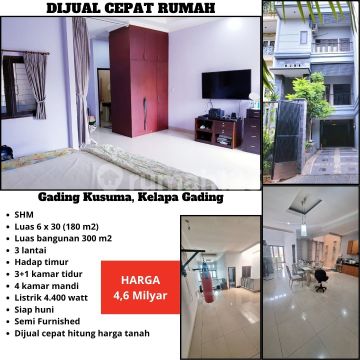 Lrnt dijual rumah 3 lantai hitung harga tanah di gading kusuma kelapa gading SHM Luas tanah 6 x 30 (180 m2) Luas bangunan 300 m2 3 lantai 3+1 kamar tidur 4 kamar mandi Listrik 4.400 watt garasi 2 mobil siap huni Semi furnished dijual cepat, hanya hitung harga tanah saja Harga 4,6 milyar Hubungi Handi 0812xxxxxxxx