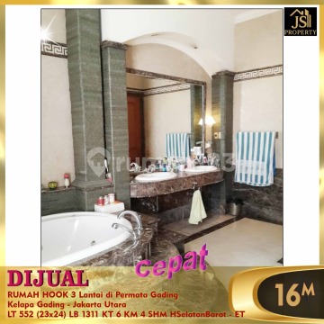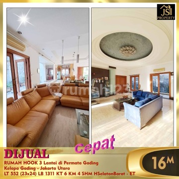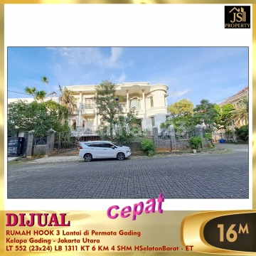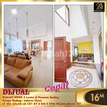 DIJUAL RUMAH HOOK 3 Lantai di Villa Permata Gading Kelapa Gading - Jakarta Utara * Posisi Hook * Kawasan Menarik * Pusat Kuliner, Gaya Hidup, Bisnis * Hunian Tenang dan nyaman * Jalan lebar Luas Tanah 552 m² Dimensi 23x24 m² Luas Bangunan 1.311 m² 3 Lantai Kamar Tidur 4 + 2 ART Kamar Mandi 3 + 1 Full Furnish Listrik 16.500 Watt Air Pam Sertifikat SHM Hadap Selatan Barat Harga 16 M Nego