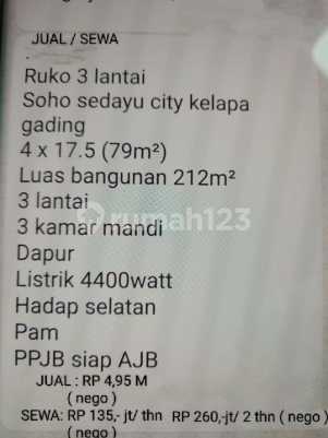 JUAL/SEWA Ruko 3 lantai Soho sedayu city kelapa gading 4 x 17.5 (79m²) Luas bangunan 212m² 3 lantai 3 kamar mandi Dapur Listrik 4400watt Hadap selatan Pam PPJB siap AJB JUAL: RP 4,95 M (nego) SEWA: RP 135,- jt/ thn RP 260,-jt/ 2 thn (nego) (nego)
