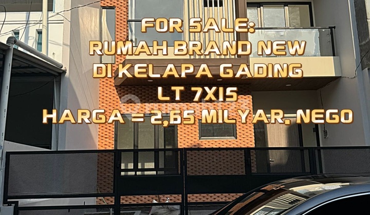 FOR SALE: Rumah Brand New 7x15 di Kelapa Gading Lokasi strategis, Lingkungan nyaman dan tenang, Keamanan 24 jam. Spesifikasi: LT 7x15 LB 140 2 lantai KT 3+1 KM 2+1 Listrik 2200 watt SHM Harga = 2,65 Milyar. Nego Bisa KPR (Dibantu sampai goal) Terima titip jual dan sewa Rumah/Ruko/Apartemen/Gudang/tanah sekitar Kelapa Gading dan Sunter. Jika berminat hub: Ronald 0812 8110 4xxx 0819 0551 1xxx