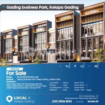 Dekat Dengan Akses Toll, Dekat Dengan Mall Artha Gading, Design Premium, Ada Privat Lift Tiap Unit. Harga Adalah Harga Cash Keras Belum Termasuk PPN For Sale - Jual Gedung Gading Business Park, Kelapa Gading, Jakarta Utara Harga. Rp 33,000,000,000 (Jual) Deskripsi Properti. Dekat Dengan Akses Toll, Dekat Dengan Mall Artha Gading, Design Premium, Ada Privat Lift Tiap Unit. Harga Adalah Harga Cash Keras Belum Termasuk PPN Luas Tanah. 220 m2 Dimensi. 10x22 Luas Bangunan. 1119 m2 Sertipikat. PPJB Kamar Tidur. - Kamar Mandi. 4 Garasi Mobil. - Hadap / View. Tengara LOCAL X Kelapa Gading ******** ⓪②① ②⑨⓪⑥ ⑧⑤⑨⑤ Whatsapp/Call. Mariana - ⓪⑧①⑥④⑧③⓪⑤⑤⓪ P3YYY-0000xxxx-ZZ-J