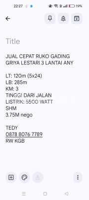 JUAL CEPAT RUKO GADING GRIYA LESTARI 3 LANTAI ANY