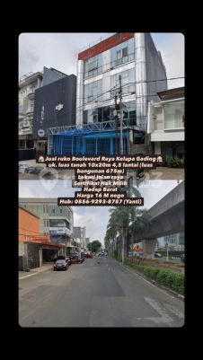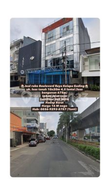 Jual ruko Boulevard Raya Kelapa Gading uk. luas tanah 10x20m 4,5 lantai (luas bangunan 675m) Lokasi jalan raya Sertifikat Hak Milik Hadap Barat Harga 16 M nego Hub: 08569293xxxxYanti)