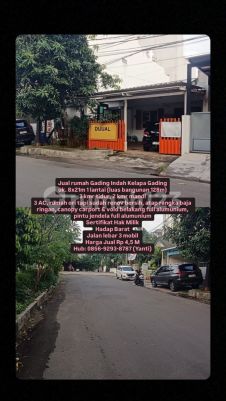 Jual rumah Gading Indah Kelapa Gading uk. 8x21m 1 lantai (luas bangunan 128m) 3 kmr tidur, 2 kmr mandi 3 AC, rumah ori tapi sudah renov bersih, atap rangka baja ringan, canopy carport & void belakang full alumunium, pintu jendela full alumunium Sertifikat Hak Milik Hadap Barat Jalan lebar 3 mobil Harga Jual Rp 4,5 M Hub: 08569293xxxxYanti)