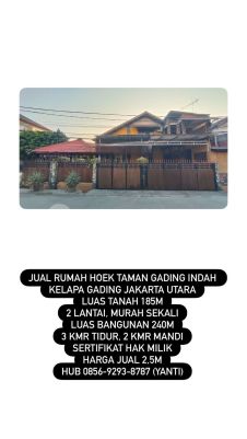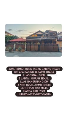 Jual Rumah Hoek Taman Gading Indah Kelapa Gading Jakarta Utara Luas tanah 185m 2 lantai, murah sekali Luas bangunan 240m 3 kmr tidur, 2 kmr mandi Sertifikat Hak Milik Harga Jual 2,5M Hub 0856xxxxxxxxYanti)
