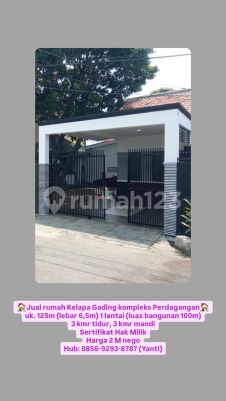 Jual rumah Kelapa Gading kompleks Perdagangan uk. 125m (lebar 6,5m) 1 lantai (luas bangunan 100m) 3 kmr tidur, 3 kmr mandi Sertifikat Hak Milik Harga 2 M nego Hub: 0856xxxxxxxxYanti)
