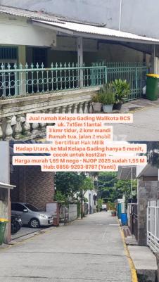 Jual rumah Kelapa Gading Walikota BCS uk. 7x15m 1 lantai 3 kmr tidur, 2 kmr mandi Rumah tua, jalan 2 mobil Sertifikat Hak Milik Hadap Utara, ke Mal Kelapa Gading hanya 5 menit, cocok untuk kost2an Harga murah 1,65 M nego - NJOP 2025 sudah 1,55 M Hub: 0856xxxxxxxxYanti)