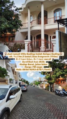 Jual rumah Villa Gading Indah Kelapa Gading uk. 9x23m 2 lantai (luas bangunan 325m) 5+1 kmr tidur, 3+1 kmr mandi Sertifikat Hak Milik Hadap Barat, jalan lebar Harga 7M nego Hub: 08569293xxxxYanti)