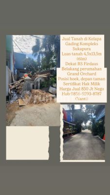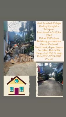 Jual Tanah di Kelapa Gading Kompleks Sukapura Luas tanah 4,5x13,5m (61m) Dekat RS Firdaus Belakang perumahan Grand Orchard Posisi hoek, depan taman Sertifikat Hak Milik Harga Jual 850 Jt Nego Hub 0856xxxxxxxxYanti)
