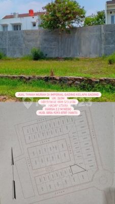 Jual tanah murah di Imperial Gading Kelapa Gading uk. 263m Sertifikat HGB s/d 2036 Hadap Utara Harga 2,2 M nego Hub: 08569293xxxxYanti)