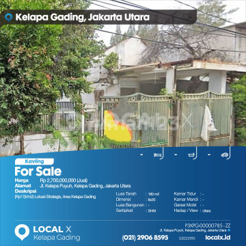 (Rp17jt/m2) Lokasi Strategis, Area Kelapa Gading For Sale - Jual Tanah Kavling Jl. Kelapa Puyuh, Kelapa Gading, Jakarta Utara Harga. Rp 270000xxxxJual) Deskripsi Properti. (Rp17jt/m2) Lokasi Strategis, Area Kelapa Gading Luas Tanah. 160 m2 Dimensi. 8x20 Luas Bangunan. 160 m2 Sertipikat. SHM Kamar Tidur. - Kamar Mandi. - Garasi Mobil. - Hadap / View. Utara LOCAL X Kelapa Gading ******** ⓪②① ②⑨⓪⑥ ⑧⑤⑨⑤ P3KPG-0000xxxx-ZZ-J