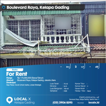 Siap Pakai, Cocok Untuk Usaha, Lokasi Strategis For Rent - Sewa Ruko Boulevard Raya, Kelapa Gading, Jakarta Utara Harga. Rp 17500xxxxSewa/Tahun) Deskripsi Properti. Siap Pakai, Cocok Untuk Usaha, Lokasi Strategis Luas Tanah. 75 m2 Dimensi. 5x15 Luas Bangunan. 150 m2 Sertipikat. HGB Kamar Tidur. - Kamar Mandi. 2 Garasi Mobil. - Hadap / View. Barat LOCAL X Kelapa Gading ******** ⓪②① ②⑨⓪⑥ ⑧⑤⑨⑤ Whatsapp/Call. Mariana - ⓪⑧①⑥④⑧③⓪⑤⑤⓪ P3KPG-0000xxxx-MT-S