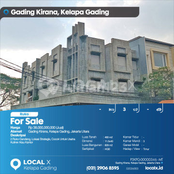 2 Ruko Gandeng, Lokasi Strategis, Cocok Untuk Usaha Kuliner Atau Kantor For Sale - Jual Ruko Gading Kirana, Kelapa Gading, Jakarta Utara Harga. Rp 3800000xxxxJual) Deskripsi Properti. 2 Ruko Gandeng, Lokasi Strategis, Cocok Untuk Usaha Kuliner Atau Kantor Luas Tanah. 460 m2 Dimensi. 11.5x40 Luas Bangunan. 828 m2 Sertipikat. HGB Kamar Tidur. - Kamar Mandi. 3 Garasi Mobil. - Hadap / View. Timur LOCAL X Kelapa Gading ******** ⓪②① ②⑨⓪⑥ ⑧⑤⑨⑤ Whatsapp/Call. Mariana - ⓪⑧①⑥④⑧③⓪⑤⑤⓪ P3KPG-0000xxxx-MT-J