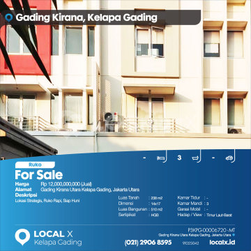 Lokasi Strategis, Ruko Rapi, Siap Huni For Sale - Jual Ruko Gading Kirana Utara Kelapa Gading, Jakarta Utara Harga. Rp 1200000xxxxJual) Deskripsi Properti. Lokasi Strategis, Ruko Rapi, Siap Huni Luas Tanah. 238 m2 Dimensi. 14x17 Luas Bangunan. 510 m2 Sertipikat. HGB Kamar Tidur. - Kamar Mandi. 3 Garasi Mobil. - Hadap / View. Timur Laut-Barat Daya LOCAL X Kelapa Gading ******** ⓪②① ②⑨⓪⑥ ⑧⑤⑨⑤ Whatsapp/Call. Mariana - ⓪⑧①⑥④⑧③⓪⑤⑤⓪ P3KPG-0000xxxx-MT-J
