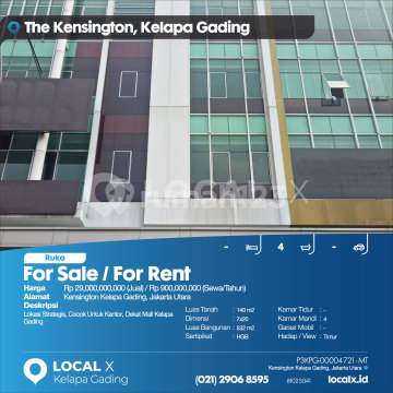 Lokasi Strategis, Cocok Untuk Kantor, Dekat Mall Kelapa Gading For Sale / For Rent - Jual / Sewa Ruko Kensington Kelapa Gading, Jakarta Utara Harga. Rp 2900000xxxxJual) / Rp 90000xxxxSewa/Tahun) Deskripsi Properti. Lokasi Strategis, Cocok Untuk Kantor, Dekat Mall Kelapa Gading Luas Tanah. 140 m2 Dimensi. 7x20 Luas Bangunan. 532 m2 Sertipikat. HGB Kamar Tidur. - Kamar Mandi. 4 Garasi Mobil. - Hadap / View. Timur LOCAL X Kelapa Gading ******** ⓪②① ②⑨⓪⑥ ⑧⑤⑨⑤ Whatsapp/Call. Mariana - ⓪⑧①⑥④⑧③⓪⑤⑤⓪ P3KPG-0000xxxx-MT-J/S