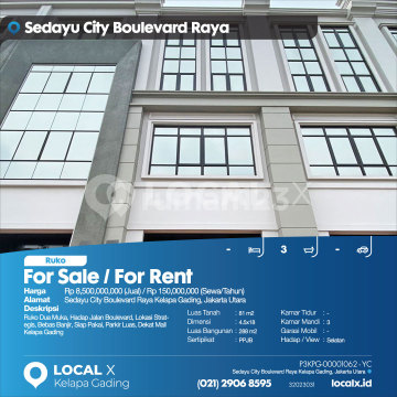 Ruko Dua Muka, Hadap Jalan Boulevard, Lokasi Strategis, Bebas Banjir, Siap Pakai, Parkir Luas, Dekat Mall Kelapa Gading For Sale / For Rent - Jual / Sewa Ruko Sedayu City Boulevard Raya Kelapa Gading, Jakarta Utara Harga. Rp 8,500,000,000 (Jual) / Rp 150,000,000 (Sewa/Tahun) Deskripsi Properti. Ruko Dua Muka, Hadap Jalan Boulevard, Lokasi Strategis, Bebas Banjir, Siap Pakai, Parkir Luas, Dekat Mall Kelapa Gading Luas Tanah. 81 m2 Dimensi. 4.5x18 Luas Bangunan. 288 m2 Sertipikat. PPJB Kamar Tidur. - Kamar Mandi. 3 Garasi Mobil. - Hadap / View. Selatan LOCAL X Kelapa Gading ******** ⓪②① ②⑨⓪⑥ ⑧⑤⑨⑤ P3KPG-0000xxxx-YC-J/S