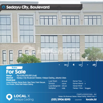 Lokasi Strategis, Bebas Banjir, Siap Pakai, Parkir Banyak, Dan Mudah, Dekat Mall Kelapa Gading For Sale - Jual Ruko Sedayu City Boulevard Selatan, Kelapa Gading, Jakarta Utara Harga. Rp 650000xxxxJual) Deskripsi Properti. Lokasi Strategis, Bebas Banjir, Siap Pakai, Parkir Banyak, Dan Mudah, Dekat Mall Kelapa Gading Luas Tanah. 67.5 m2 Dimensi. 4.5x15 Luas Bangunan. 270 m2 Sertipikat. HGB Kamar Tidur. - Kamar Mandi. 4 Garasi Mobil. - Hadap / View. Tenggara LOCAL X Kelapa Gading ******** ⓪②① ②⑨⓪⑥ ⑧⑤⑨⑤ P3KPG-0000xxxx-JW-J