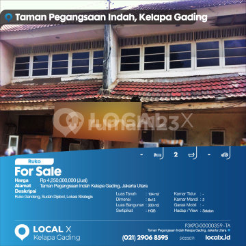 Ruko Gandeng, Sudah Dijebol, Lokasi Strategis For Sale - Jual Ruko Taman Pegangsaan Indah Kelapa Gading, Jakarta Utara Harga. Rp 425000xxxxJual) Deskripsi Properti. Ruko Gandeng, Sudah Dijebol, Lokasi Strategis Luas Tanah. 104 m2 Dimensi. 8x13 Luas Bangunan. 200 m2 Sertipikat. HGB Kamar Tidur. - Kamar Mandi. 2 Garasi Mobil. - Hadap / View. Selatan LOCAL X Kelapa Gading ******** ⓪②① ②⑨⓪⑥ ⑧⑤⑨⑤ P3KPG-0000xxxx-TA-J