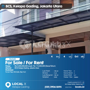Rumah Rapi, Minimalis, Siap Huni For Sale / For Rent - Jual / Sewa Rumah BCS Kelapa Gading, Jakarta Utara Harga. Rp 350000xxxxJual) / Rp 11500xxxxSewa/Tahun) Deskripsi Properti. Rumah Rapi, Minimalis, Siap Huni Luas Tanah. 105 m2 Dimensi. 7x15 Luas Bangunan. 182 m2 Sertipikat. SHM Kamar Tidur. 4 Kamar Mandi. 4 Garasi Mobil. 0+1 Hadap / View. Selatan LOCAL X Kelapa Gading ******** 0212906xxxx P3KPG-0000xxxx-ZZ-J/S