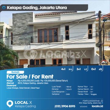Lokasi Strategis, Dekat Sekolah, Dekat Pasar For Sale / For Rent - Jual / Sewa Rumah BCS, Kelapa Gading, Jakarta Utara Harga. Rp 400000xxxxJual) / Rp 10500xxxxSewa/Tahun) Deskripsi Properti. Lokasi Strategis, Dekat Sekolah, Dekat Pasar Luas Tanah. 159 m2 Dimensi. 10.5x15 Luas Bangunan. 159 m2 Sertipikat. SHM Kamar Tidur. 4+1 Kamar Mandi. 3+1 Garasi Mobil. 0+1 Hadap / View. Tenggara LOCAL X Kelapa Gading ******** 0212906xxxx P3KPG-0000xxxx-ZZ-J/S