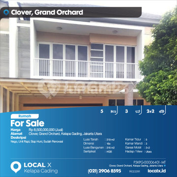 Nego, Unit Rapi, Siap Huni, Sudah Renovasi For Sale - Jual Rumah Clover, Grand Orchard, Kelapa Gading, Jakarta Utara Harga. Rp 850000xxxxJual) Deskripsi Properti. Nego, Unit Rapi, Siap Huni, Sudah Renovasi Luas Tanah. 319 m2 Dimensi. 16x Luas Bangunan. 316 m2 Sertipikat. HGB Kamar Tidur. 5 Kamar Mandi. 3 Garasi Mobil. 2+2 Hadap / View. Utara LOCAL X Kelapa Gading ******** ⓪②① ②⑨⓪⑥ ⑧⑤⑨⑤ Whatsapp/Call. Mariana - ⓪⑧①⑥④⑧③⓪⑤⑤⓪ P3KPG-0000xxxx-MT-J