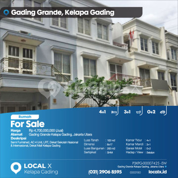 Semi Furnished, AC 4 Unit, LRT, Dekat Sekolah Nasional & Internasional, Dekat Mall Kelapa Gading For Sale - Jual Rumah Gading Grande Kelapa Gading, Jakarta Utara Harga. Rp 470000xxxxJual) Deskripsi Properti. Semi Furnished, AC 4 Unit, LRT, Dekat Sekolah Nasional & Internasional, Dekat Mall Kelapa Gading Luas Tanah. 102 m2 Dimensi. 6x17 Luas Bangunan. 200 m2 Sertipikat. SHM Kamar Tidur. 4+1 Kamar Mandi. 3+1 Garasi Mobil. 0+2 Hadap / View. Selatan LOCAL X Kelapa Gading ******** ⓪②① ②⑨⓪⑥ ⑧⑤⑨⑤ P3KPG-0000xxxx-EW-J