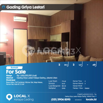 Brand New, Full Furnished, Kitchen Set, Meja Makan, Kamar Set, Ada AC 2 Unit For Sale - Jual Rumah Gading Griya Lestari Kelapa Gading, Jakarta Utara Harga. Rp 165000xxxxJual) Deskripsi Properti. Brand New, Full Furnished, Kitchen Set, Meja Makan, Kamar Set, Ada AC 2 Unit Luas Tanah. 75 m2 Dimensi. 5x15 Luas Bangunan. 90 m2 Sertipikat. SHM Kamar Tidur. 2 Kamar Mandi. 2 Garasi Mobil. - Hadap / View. Selatan LOCAL X Kelapa Gading ******** ⓪②① ②⑨⓪⑥ ⑧⑤⑨⑤ P3KPG-0000xxxx-TA-J