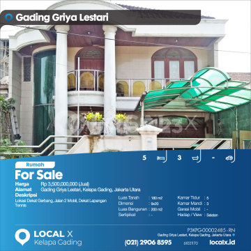 Lokasi Dekat Gerbang, Jalan 2 Mobil, Dekat Lapangan Tennis For Sale - Jual Rumah Gading Griya Lestari, Kelapa Gading, Jakarta Utara Harga. Rp 350000xxxxJual) Deskripsi Properti. Lokasi Dekat Gerbang, Jalan 2 Mobil, Dekat Lapangan Tennis Luas Tanah. 180 m2 Dimensi. 9x20 Luas Bangunan. 200 m2 Sertipikat. SHM Kamar Tidur. 5 Kamar Mandi. 3 Garasi Mobil. - Hadap / View. Selatan LOCAL X Kelapa Gading ******** ⓪②① ②⑨⓪⑥ ⑧⑤⑨⑤ P3KPG-0000xxxx-RN-J