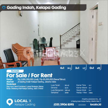 Siap Huni, Semi Furnished, Lokasi Strategis, Bebas Banjir, Belakang Mall Kelapa Gading, Jalan 2 Mobil For Sale / For Rent - Jual / Sewa Rumah Gading Indah, Kelapa Gading, Jakarta Utara Harga. Rp 289000xxxxJual) / Rp 6500xxxxSewa/Tahun) Deskripsi Properti. Siap Huni, Semi Furnished, Lokasi Strategis, Bebas Banjir, Belakang Mall Kelapa Gading, Jalan 2 Mobil Luas Tanah. 90 m2 Dimensi. 6x15 Luas Bangunan. 200 m2 Sertipikat. SHM Kamar Tidur. 4+1 Kamar Mandi. 3+1 Garasi Mobil. 0+1 Hadap / View. Utara LOCAL X Kelapa Gading ******** ⓪②① ②⑨⓪⑥ ⑧⑤⑨⑤ P3KPG-0000xxxx-ZZ-J/S